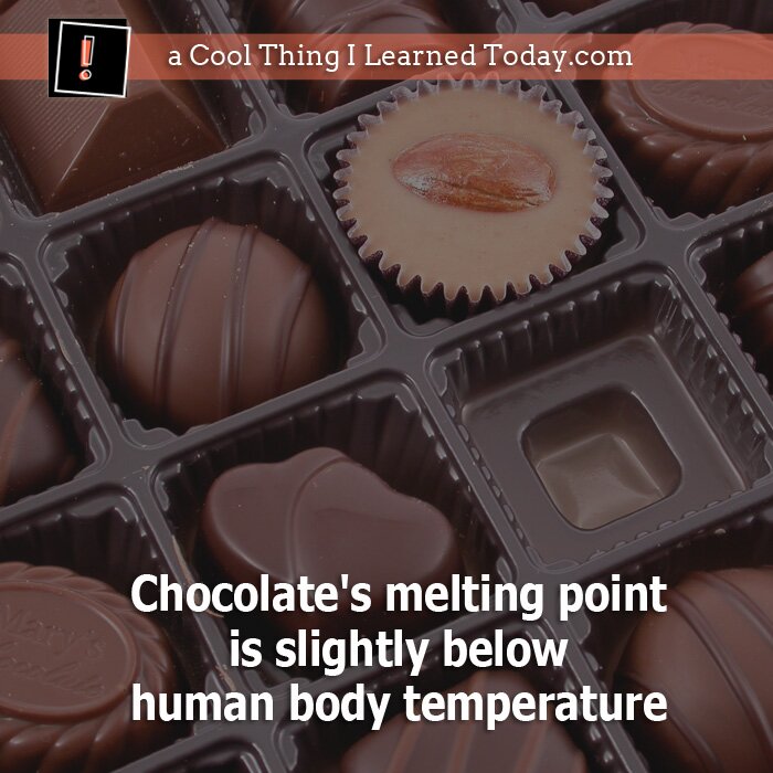 Why does chocolate melt in your mouth? Well, mainly due to Cocoa butter which is a major ingredient in all kinds of Chocolate, (including white chocolate), the Cocoa butter melts near body temperature (37 °C) and thus makes sure that when we insert chocolate into our mouth, it’ll reach it’s melting point and convert back to yummy liquid.
